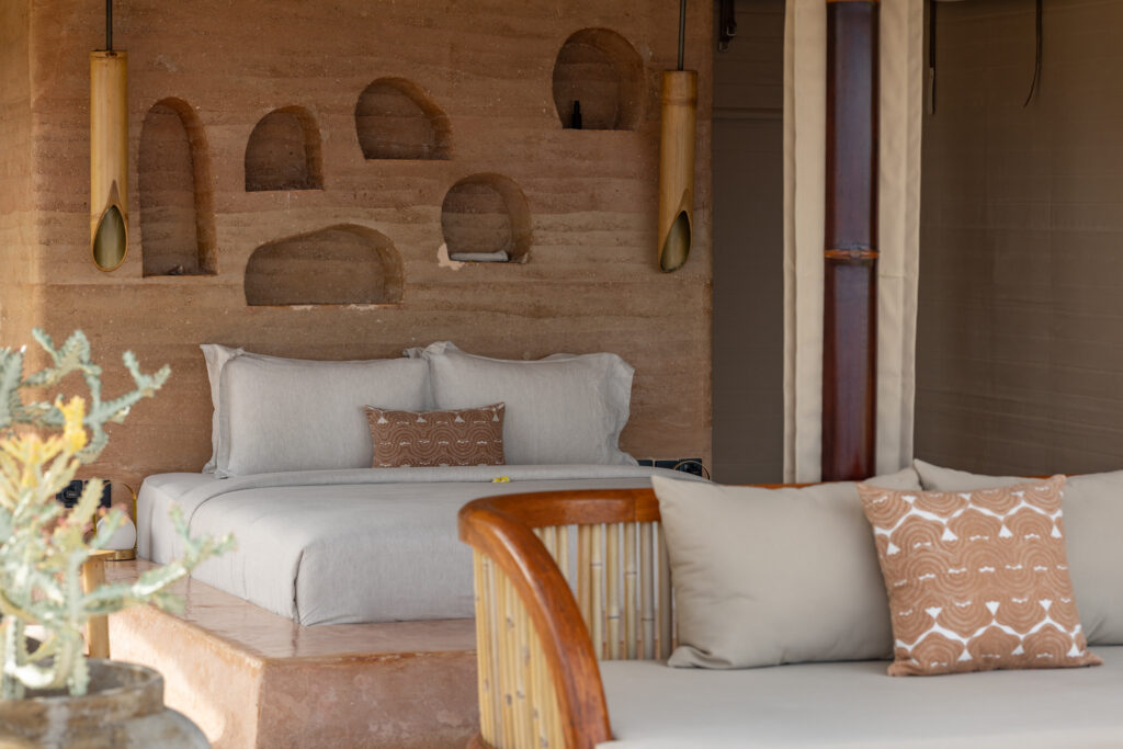 Intaaya offers 13 luxury tent suites designed with natural rammed earth walls and floors, blending sustainability with refined comfort. Artisanal interiors, organic linens, and natural fabrics create a serene space for rest and renewal.