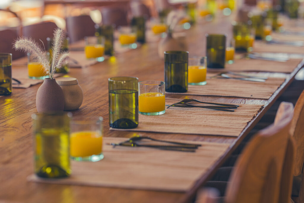 Water and waste are consciously managed, energy use is minimized, and food is sourced locally with a seasonal, plant-forward focus.